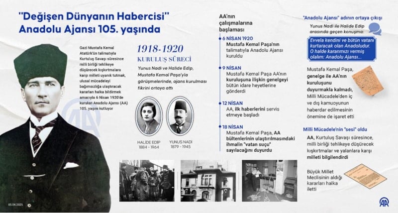 Gazi Mustafa Kemal Atatürk'ün talimatıyla Kurtuluş Savaşı süresince milli birliği tehlikeye düşürecek kışkırtmalara karşı milleti uyanık tutmak, ulusal mücadeleyi bağımsızlığa ulaştıracak kararları halka bildirmek amacıyla 6 Nisan 1920'de kurulan Anadolu Ajansı, 105. yaşını kutluyor.