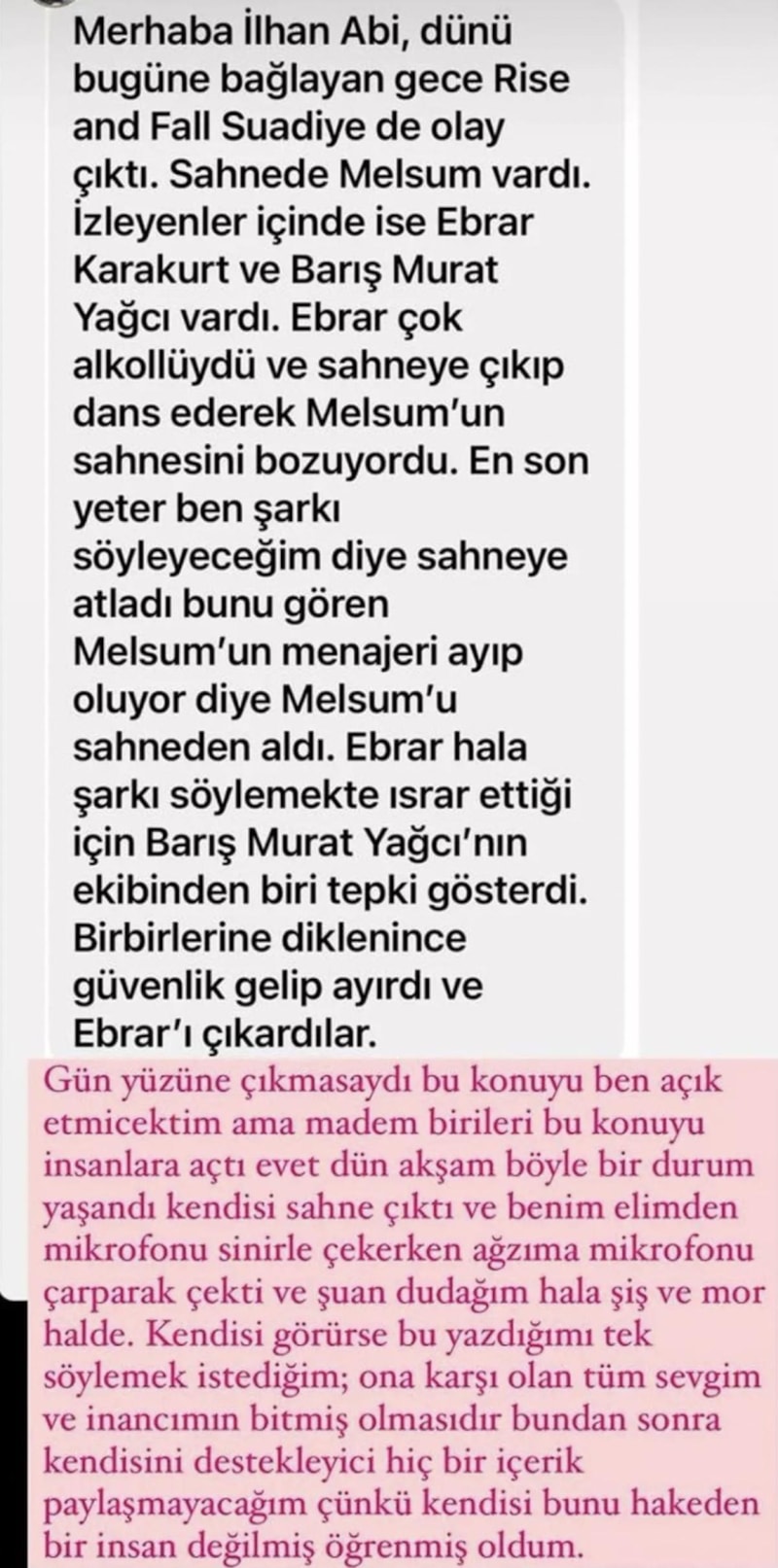 Paylaşımda, "Dünü bugüne bağlayan gece olay çıktı. Sahnede Melsum vardı. İzleyenler içinde de Ebrar Karakurt ve Barış Murat Yağcı da vardı. Ebrar, çok alkollüydü ve sahneye çıkıp dans ederek Melsum'un sahnesini bozdu. En son 'Yeter ben şarkı söyleyeceğim' diye sahneye atladı bunu gören Melsum'un menajeri ayıp oluyor diye Melsum'u sahneden aldı. Ebrar, hâlâ şarkı söylemekte ısrar ettiği için Barış Murat Yağcı'nın ekibinden biri tepki gösterdi. Birbirlerine diklenince güvenlik gelip ayırdı ve Ebrar'ı çıkardı." ifadeleri yer aldı.