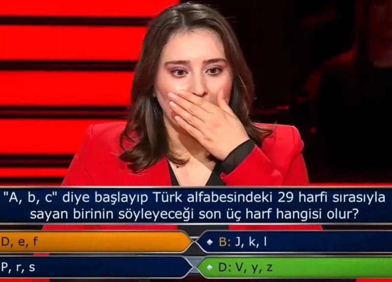 Yarışmacının karşısında ilk soruda karşısına, "A, b, c" diye başlayıp Türk alfabesindeki 29 harfi sırasıyla sayan birinin söyleyeceği son üç harf hangisi olur?" sorusu çıktı.