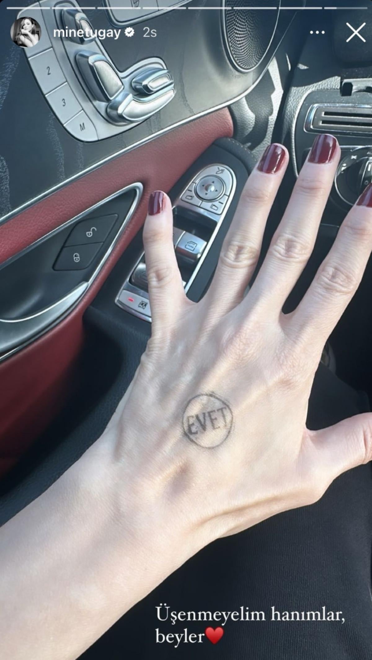 Oyunu kullanan Mine Tugay elinde evet mührünün basılı olduğu bir kareyi paylaşarak "Üşenmeyelim hanımlar beyler" notunu ekledi.