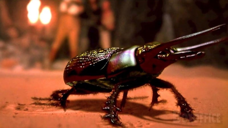 Filmdeki sahnede, scarab böceklerinin büyük, siyah ve metalik görünümleri, adeta bir kabuklu böcek gibi hareket ederken, izleyicilere büyük bir korku ve gerilim hissi yaratır.