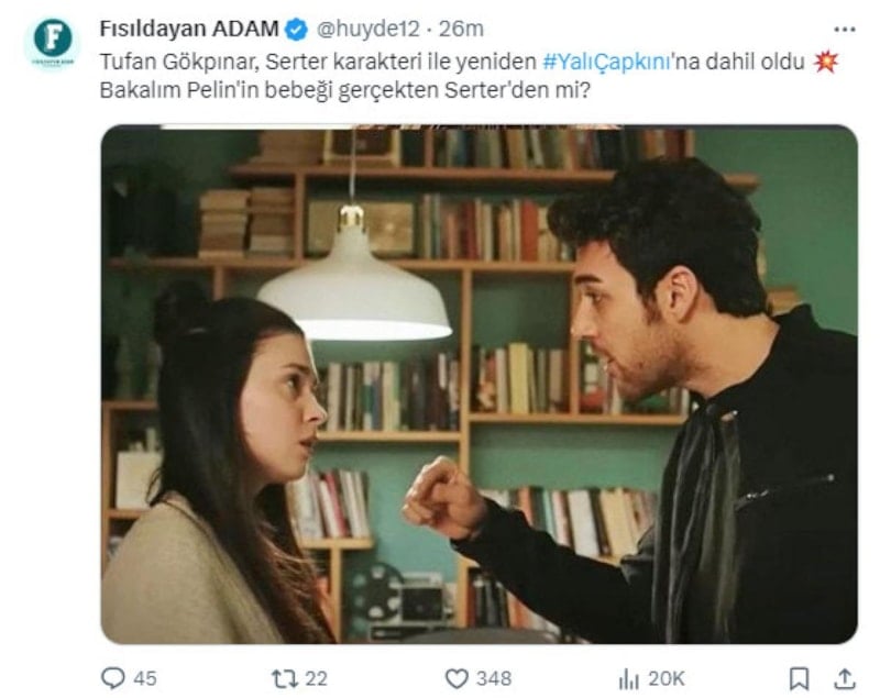 Sosyal medyada Fısıldayan Adam'ın haberine göre; Pelin'in eski sevgilisi Serter karakterini canlandıran Tufan Gökpınar, Yalı Çapkını dizisine geri döndü.