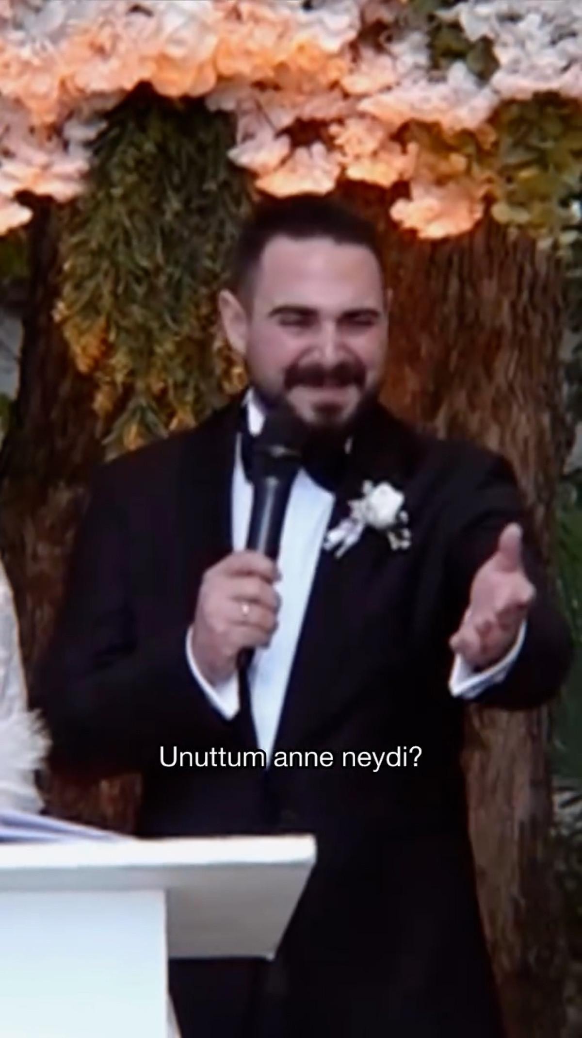Şaşkınlık içinde annesine dönen damat, "Unuttum anne, neydi?" diyerek salondaki herkesi gülümsetti.