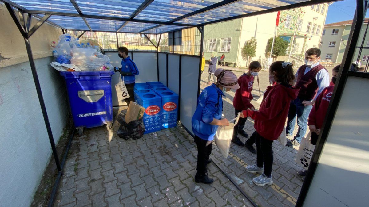 Türkiye'de depozitolu ambalaj sistemine geçilmeye hazırlanılırken, Kocaeli Körfez Çelik Sanayi Ortaokulu’nda başlatılan geri dönüşüm kampanyasında öğrencilerin kartlarına, okula getirdikleri geri dönüşüm malzemesi miktarı karşılığında para yükleniyor.