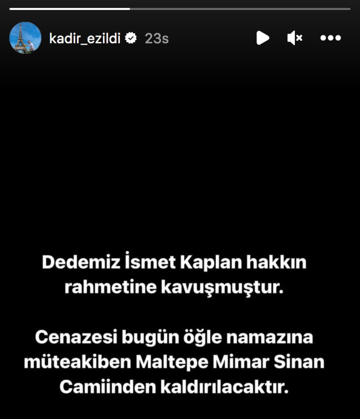 Kadir Ezildi sosyal medya hesabından yaptığı açıklama ile dedesi İsmet Kaplan'ın hayatını kaybettiğini açıkladı.