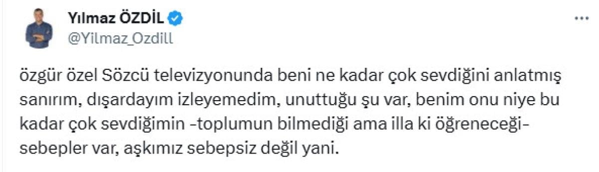 Özgür Özel Sözcü televizyonunda beni ne kadar çok sevdiğini anlatmış sanırım, dışardayım izleyemedim, unuttuğu şu var, benim onu niye bu kadar çok sevdiğimin -toplumun bilmediği ama illa ki öğreneceği- sebepler var, aşkımız sebepsiz değil yani.