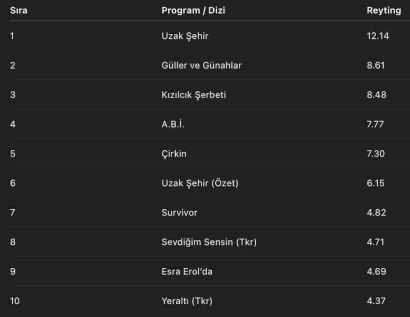 İkinci sırada yeni bölümü yayınlanan Güller ve Günahlar, üçüncü sırada ise Kızılcık Şerbeti yer aldı.