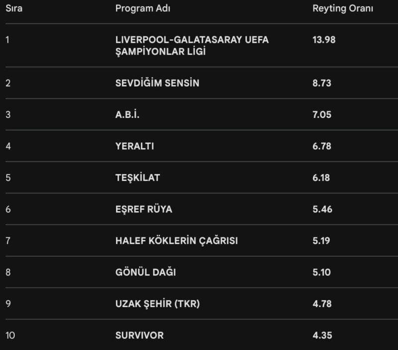 Reyting sıralamasında ikinci sırada Sevdiğim Sensin dizisi, üçüncü sırada ise A.B.İ. dizisi yer aldı.