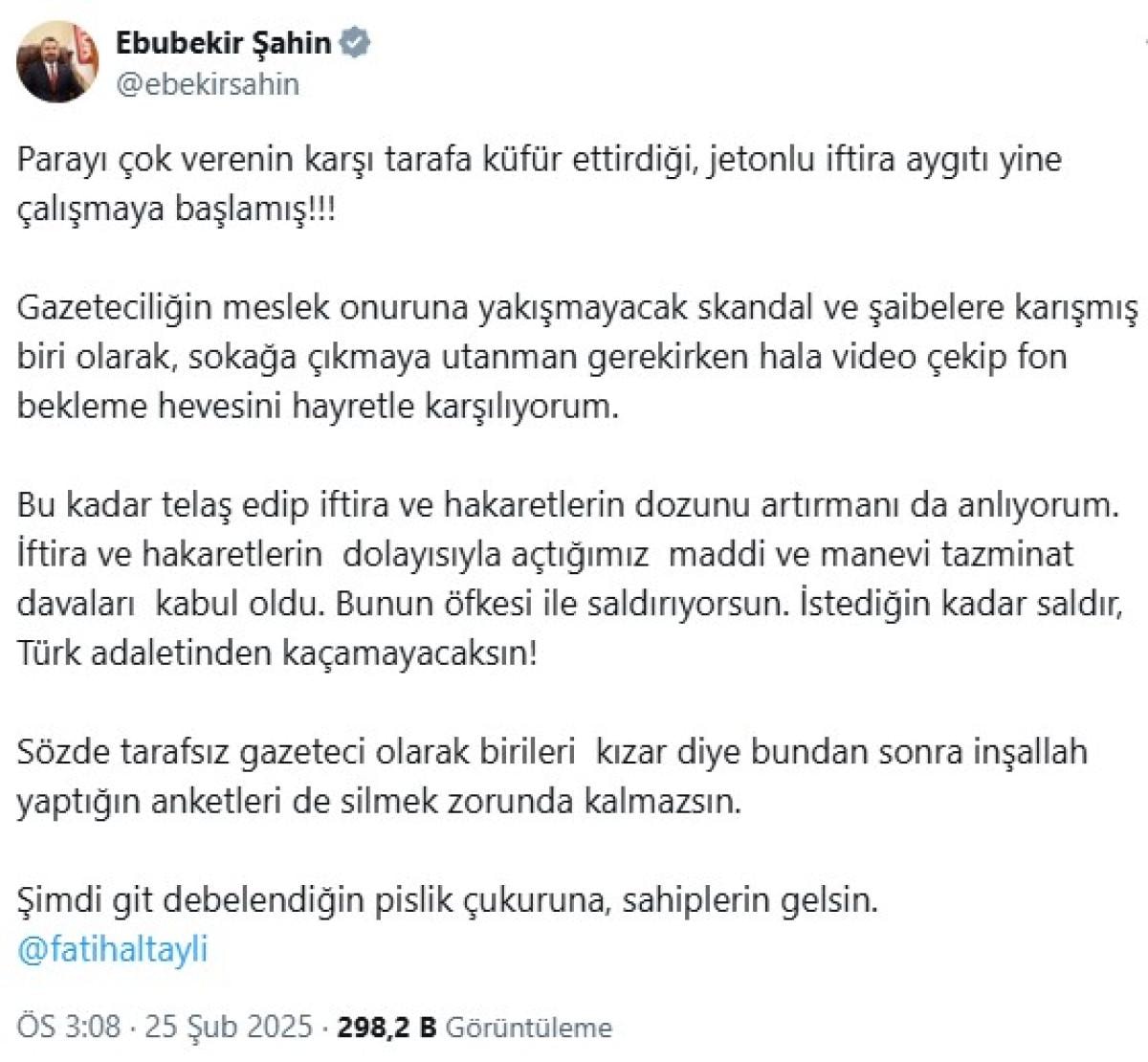 Şahin, sosyal medya hesabından yaptığı açıklamada, Altaylı hakkında açtıkları maddi ve manevi tazminat davalarının kabul edildiğini belirterek, “Mahkeme kararlarının ardından öfke ile saldırıyorsun. Ne kadar uğraşırsan uğraş, Türk adaletinden kaçamayacaksın!” ifadelerini kullandı.