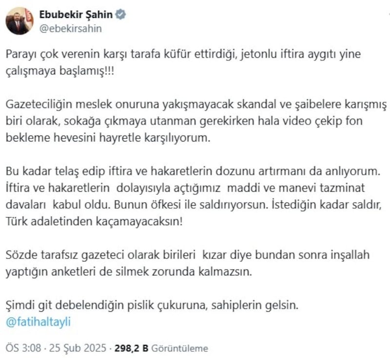 Parayı çok verenin karşı tarafa küfür ettirdiği, jetonlu iftira aygıtı yine çalışmaya başlamış!!! Gazeteciliğin meslek onuruna yakışmayacak skandal ve şaibelere karışmış biri olarak, sokağa çıkmaya utanman gerekirken hala video çekip fon bekleme hevesini hayretle karşılıyorum. Bu kadar telaş edip iftira ve hakaretlerin dozunu artırmanı da anlıyorum. İftira ve hakaretlerin dolayısıyla açtığımız maddi ve manevi tazminat davaları kabul oldu. Bunun öfkesi ile saldırıyorsun. İstediğin kadar saldır, Türk adaletinden kaçamayacaksın! Sözde tarafsız gazeteci olarak birileri kızar diye bundan sonra inşallah yaptığın anketleri de silmek zorunda kalmazsın. Şimdi git debelendiğin pislik çukuruna, sahiplerin gelsin, Fatih Altaylı.