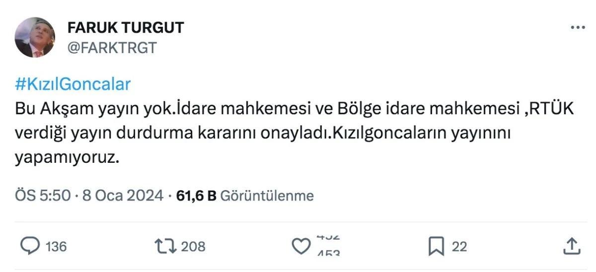 Kızıl Goncalar dizisinin yapımcısı olan Faruk Turgut, açıklamasında yayın durdurma cezasının onaylandığını belirterek dizinin ekranda olmayacağını söyledi: