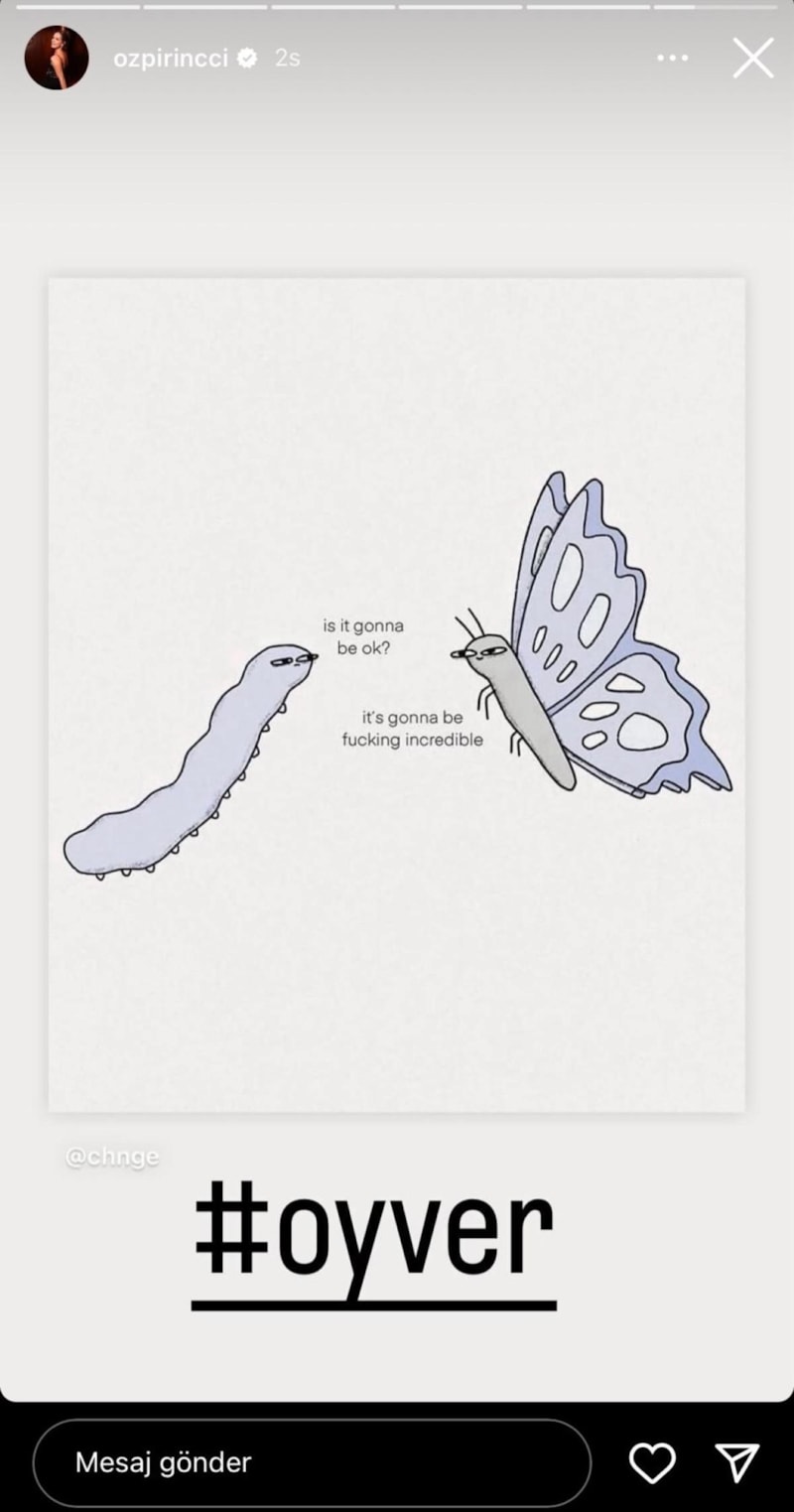 Özpirinçci, sosyal medya hesabından yaptığı paylaşımda bir tırtıl ile kelebeğin diyaloğunu “#oyver” etiketi ile paylaştı.