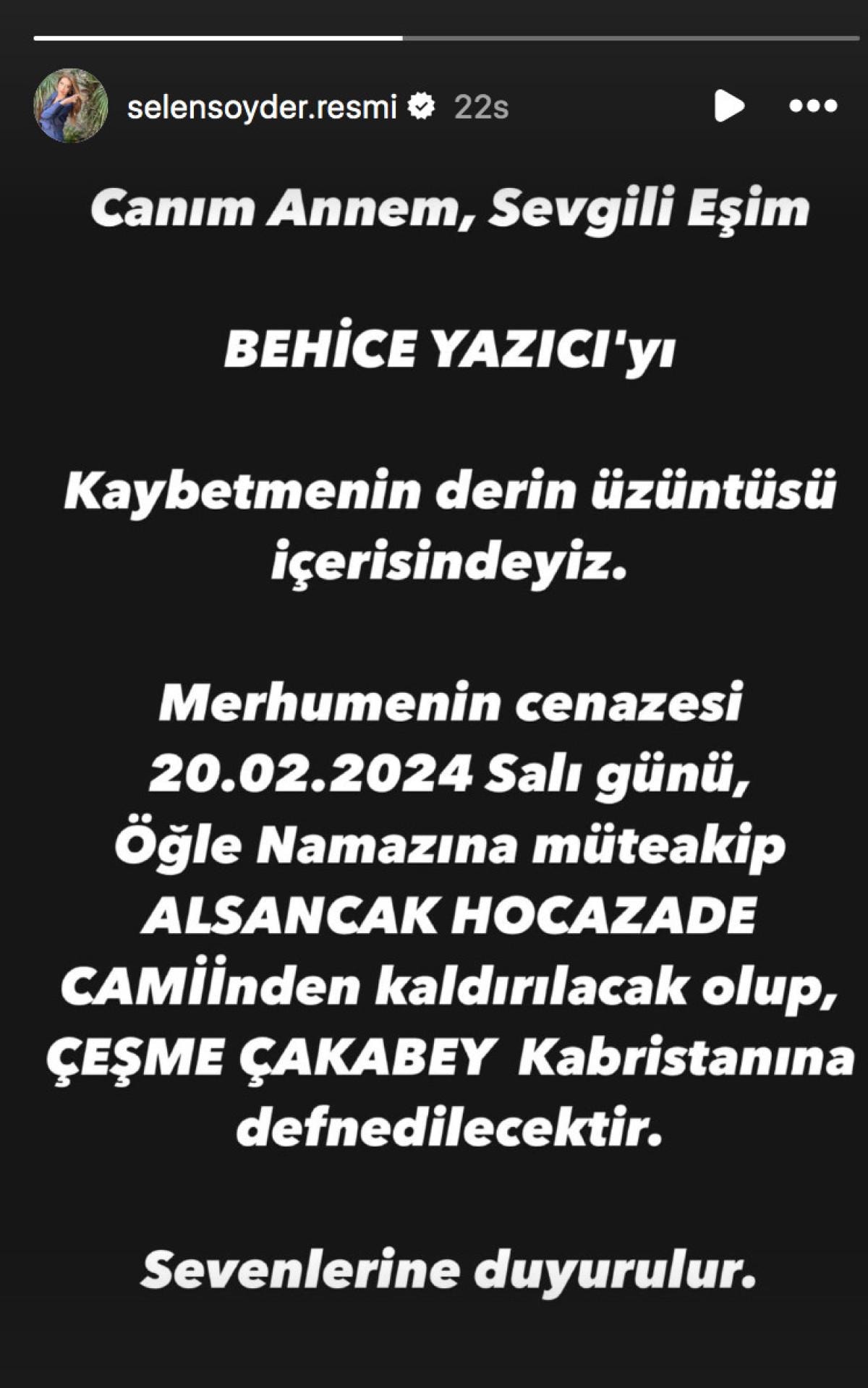 "Canım annem Behice Yazıcı'yı kaybetmenin derin üzüntüsü içerisindeyiz. Merhumenin cenazesi 20.02.2024 Salı günü öğle namazına müteakip Alsancak Hocazade Camii'nden kaldırılacak olup, Çeşme Çakabey Kabristanı'na defnedilecektir."