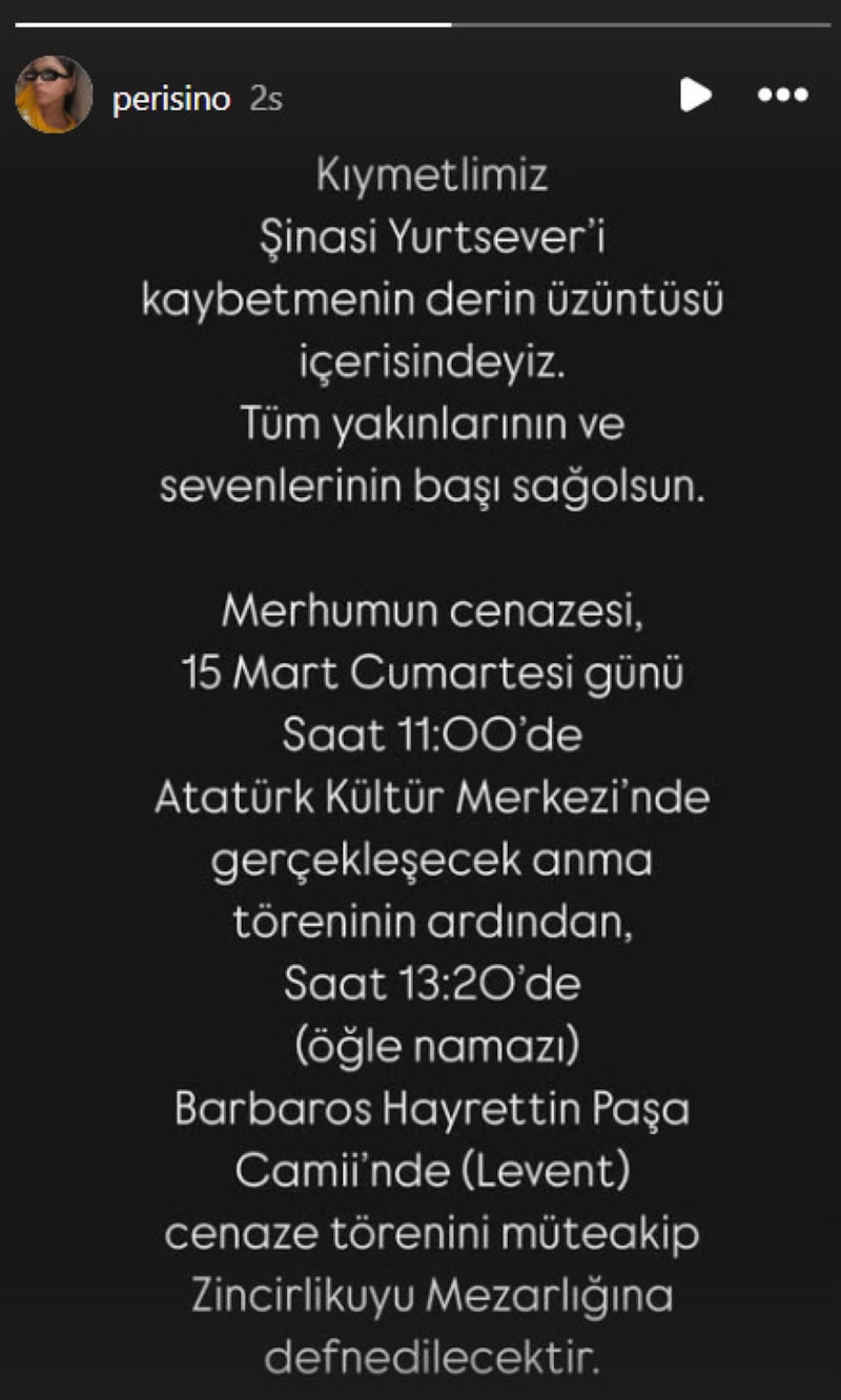 Oyuncunun eşi Ferihan Yurtsever, konuyla ilgili sosyal medya hesabından paylaşım yaptı. İşte, Şinasi Yurtsever'in cenaze programı...