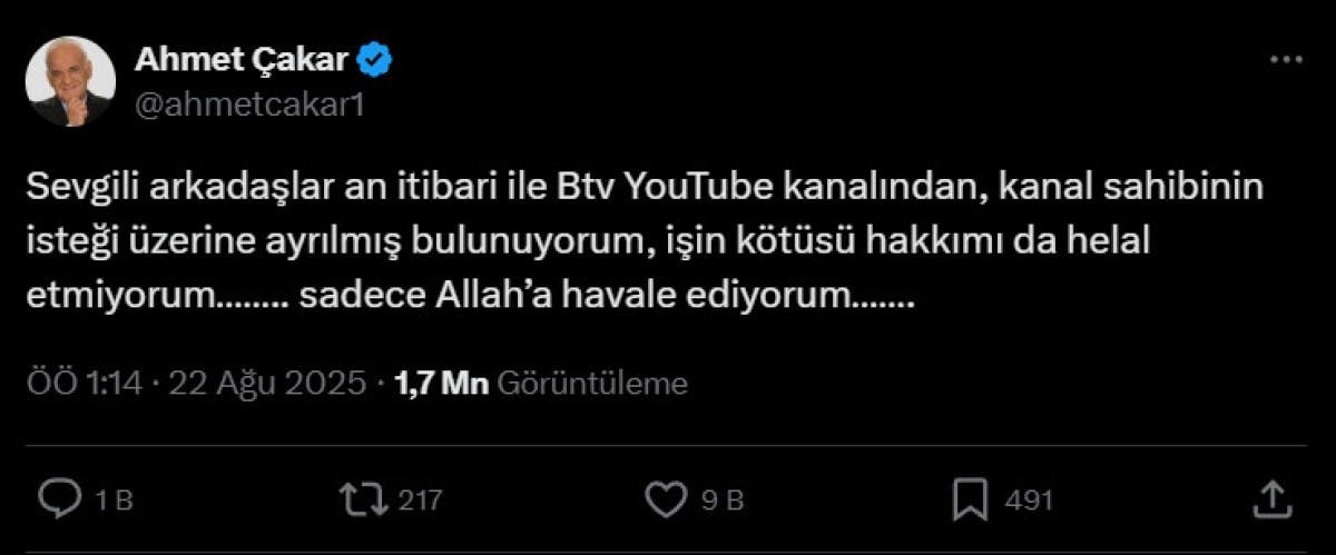 "Sevgili arkadaşlar an itibari ile Btv YouTube kanalından, kanal sahibinin isteği üzerine ayrılmış bulunuyorum. İşin kötüsü hakkımı da helal etmiyorum. Sadece Allah’a havale ediyorum..."