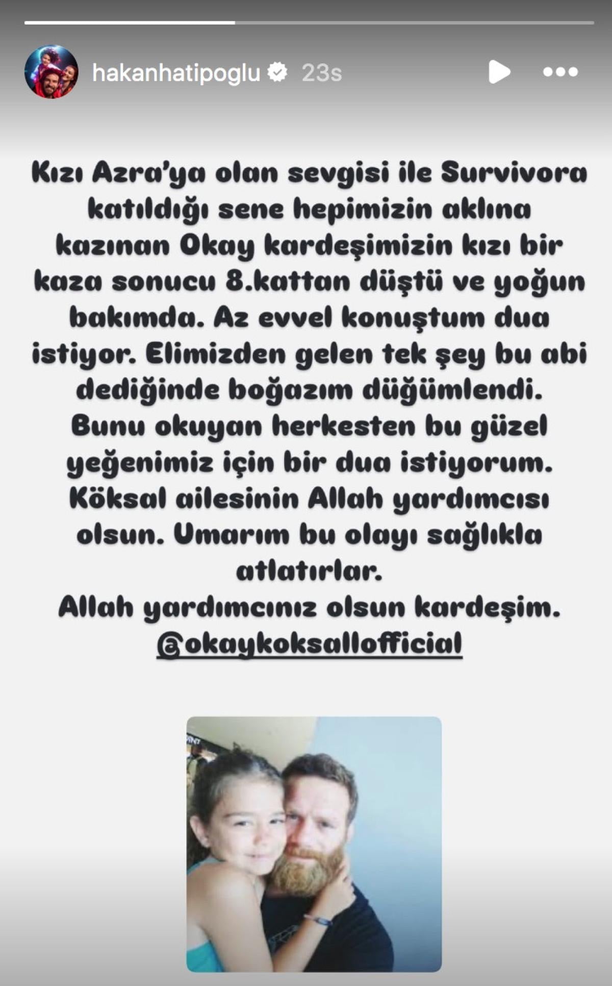 "Kızı Azra'ya olan sevgisi ile Survivor'a katıldığı sene hepimizin aklına kazınan Okay kardeşimizin kızı bir kaza sonucu 8.kattan düştü ve yoğun bakımda. Az evvel konuştum dua istiyor. 'Elimizden gelen tek şey bu' abi dediğinde boğazım düğümlendi. Bunu okuyan herkesten bu güzel yeğenimiz için bir dua istiyorum. Köksal ailesinin Allah yardımcısı olsun. Umarım bu olayı sağlıkla atlatırlar. Allah yardımcınız olsun kardeşim"