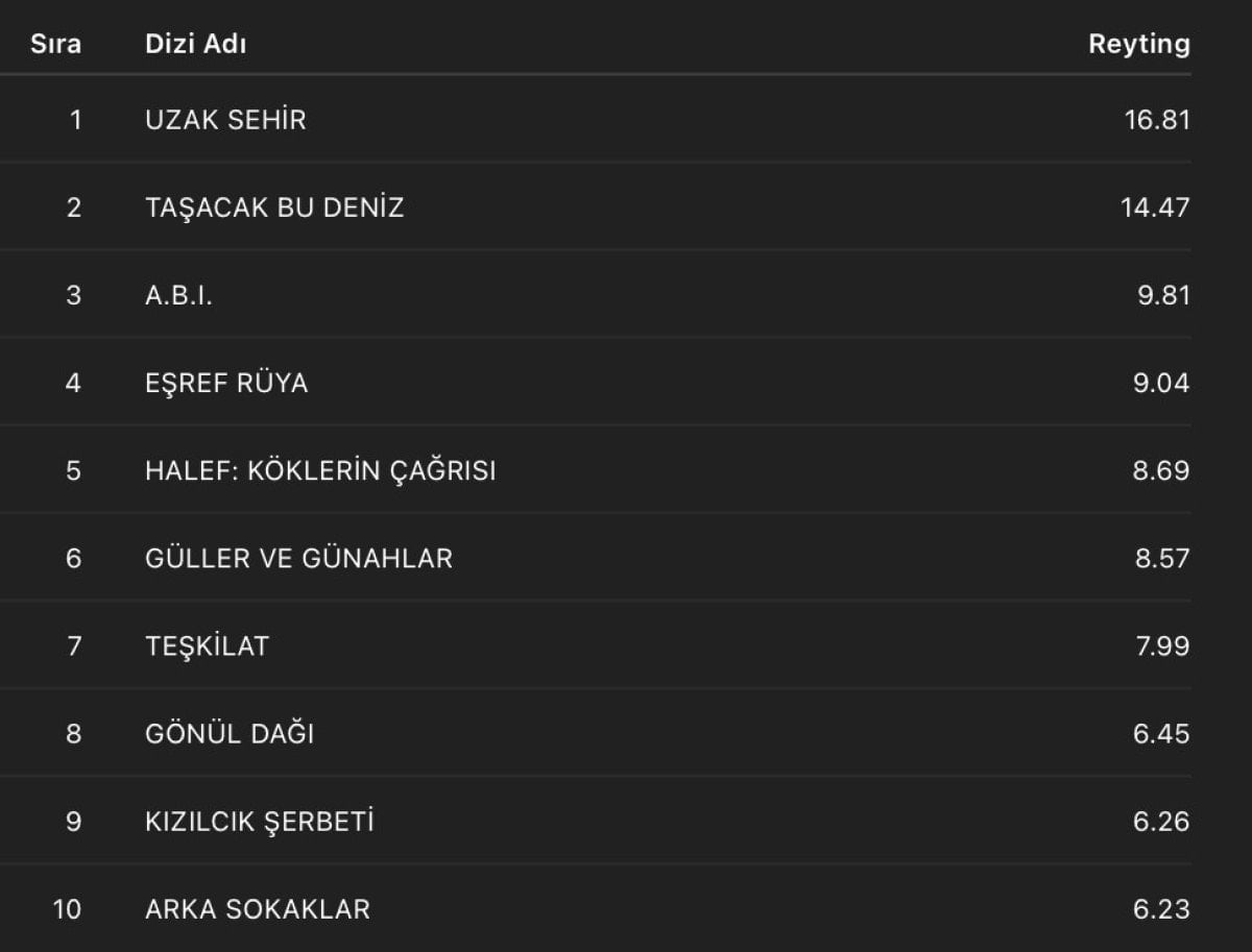 - TİAK verilerine göre, Uzak Şehir dizisi zirvede yer aldı.
