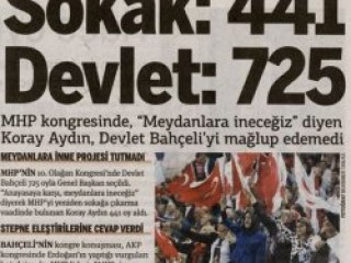 Taraf Gazetesi bugün sürmanşetinde MHP Genel Başkanlığı seçimini ilgi çekici bir şekilde gördü. "Sokak: 441 Devlet:725" sürmanşetini gören Taraf