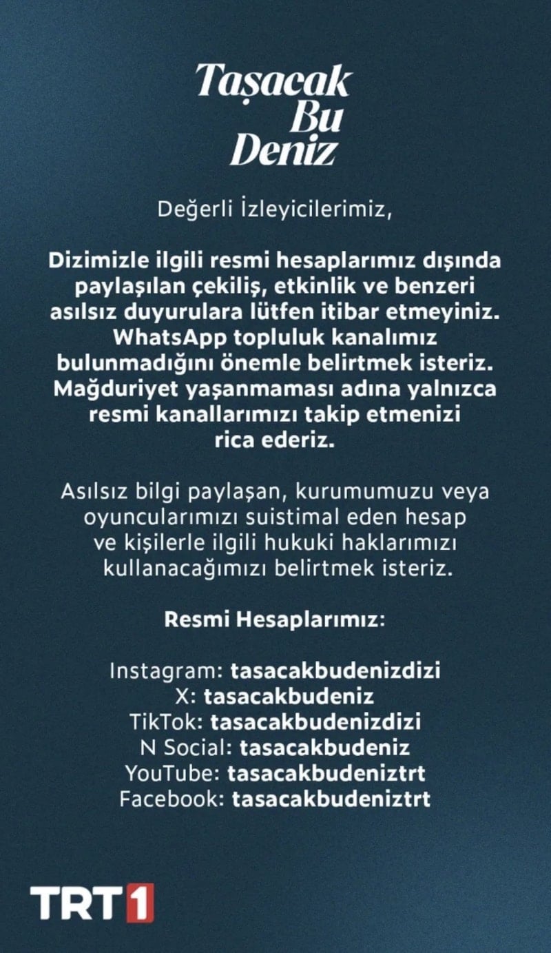 Taşacak Bu Deniz sosyal medya hesaplarından yapılan açıklamada, “Değerli İzleyicilerimiz, Dizimizle ilgili resmi hesaplarımız dışında paylaşılan çekiliş, etkinlik ve benzeri asılsız duyurulara lütfen itibar etmeyiniz. WhatsApp topluluk kanalımız bulunmadığını önemle belirtmek isteriz. Mağduriyet yaşanmaması adına yalnızca resmi kanallarımızı takip etmenizi rica ederiz. Asılsız bilgi paylaşan, kurumumuzu veya oyuncularımızı suistimal eden hesap ve kişilerle ilgili hukuki haklarımızı kullanacağımızı belirtmek isteriz." denildi.