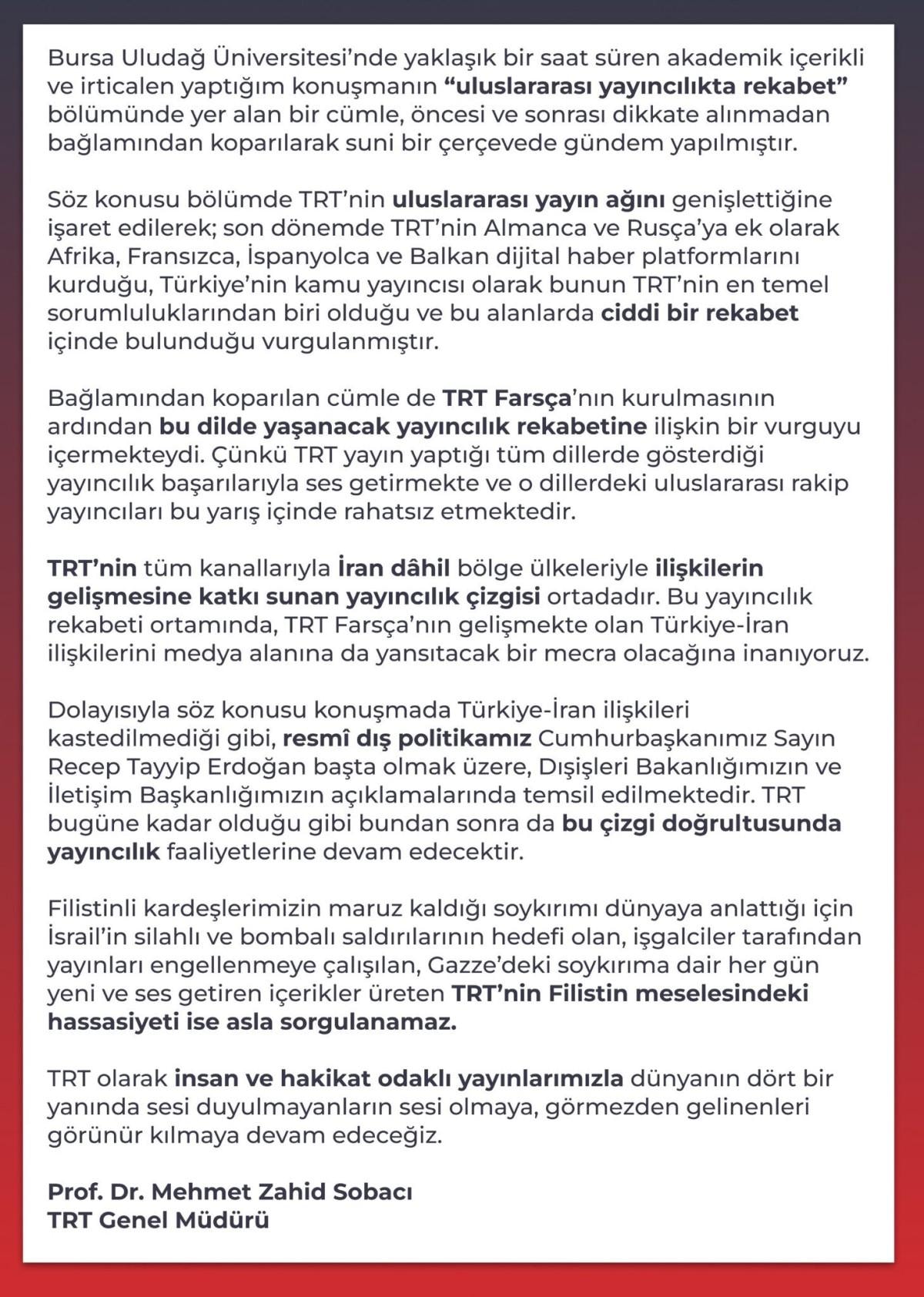TRT Genel Müdürü Mehmet Zahid Sobacı, Bursa Uludağ Üniversitesi’ndeki konuşmasında İran'ı hedef aldığı iddialarına yanıt verdi.