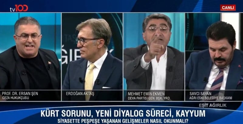 Tv100 canlı yayınında arasında büyük bir tartışma yaşandı. Nabzın bir hayli yükseldiği programda DEVA Partili Mehmet Emin Ekmen, sözünü kesen Prof. Dr. Ersan Şen'e sert tepki gösterdi.