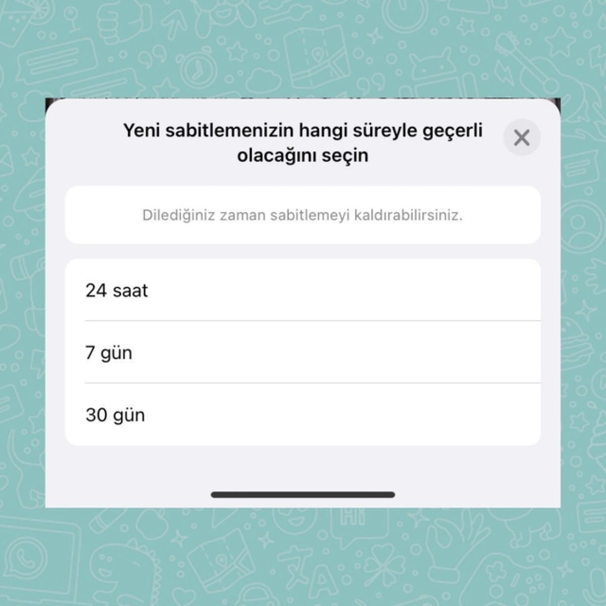 3. Sabitle seçeneğine bastığınızda WhatsApp size bu mesajı ne kadar süreliğine sabitlemek istediğinizi soracak.