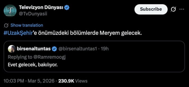 Kanal D’nin rekortmen dizisi Uzak Şehir, son bölümüyle soluksuz izlendi. Dizinin akıbeti ile ilgili sosyal medyada tartışmalar büyürken, izleyiciyi heyecanlandıran bir gelişme geldi. Cihan’ın geçmişinden gelen Meryem karakterinin diziye katılacağı duyuruldu.