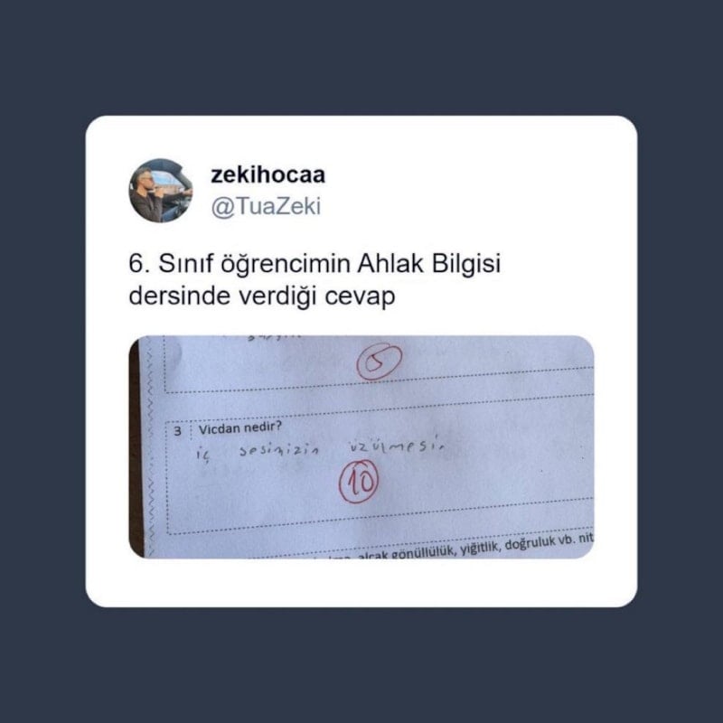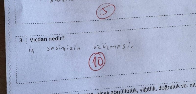 Sınavda yer alan "Vicdan nedir?" sorusuna öğrencinin yazdığı kısa fakat etkileyici tanım, görenlerin dikkatini çekti.