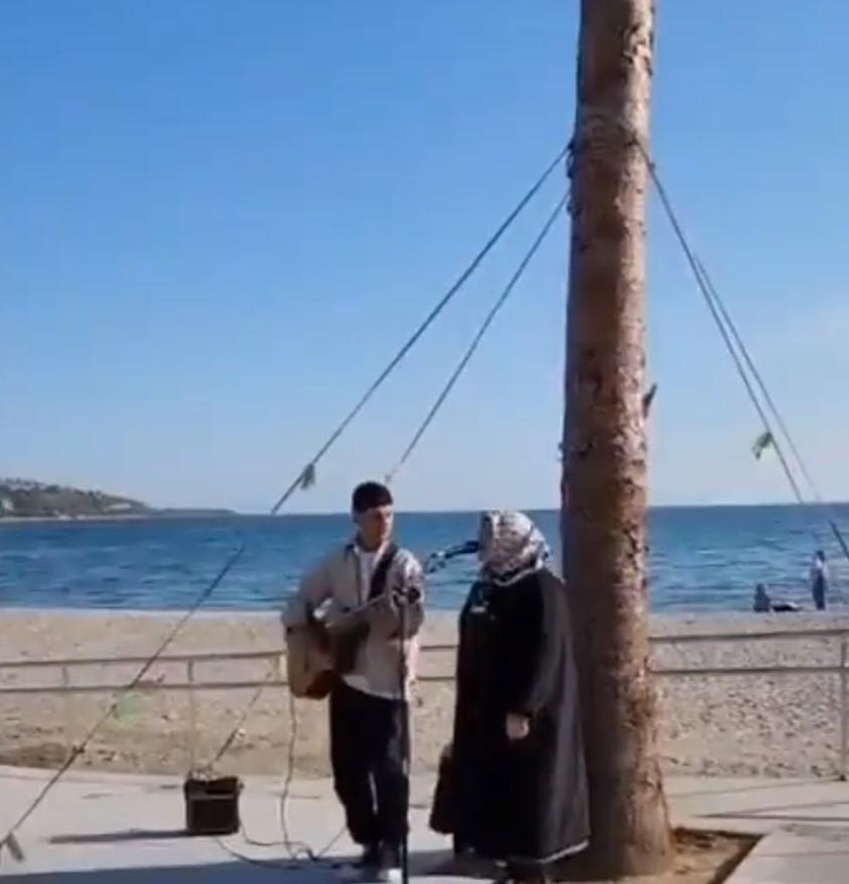 Bir sokak sanatçısı, ekipmanlarını sahil önüne taşıdı, şarkılarını söylemeye başladı.
