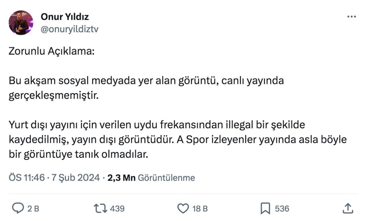 "Zorunlu Açıklama... Bu akşam sosyal medyada yer alan görüntü, canlı yayında gerçekleşmemiştir. Yurt dışı yayını için verilen uydu frekansından illegal bir şekilde kaydedilmiş, yayın dışı görüntüdür. A Spor izleyenler yayında asla böyle bir görüntüye tanık olmadılar."