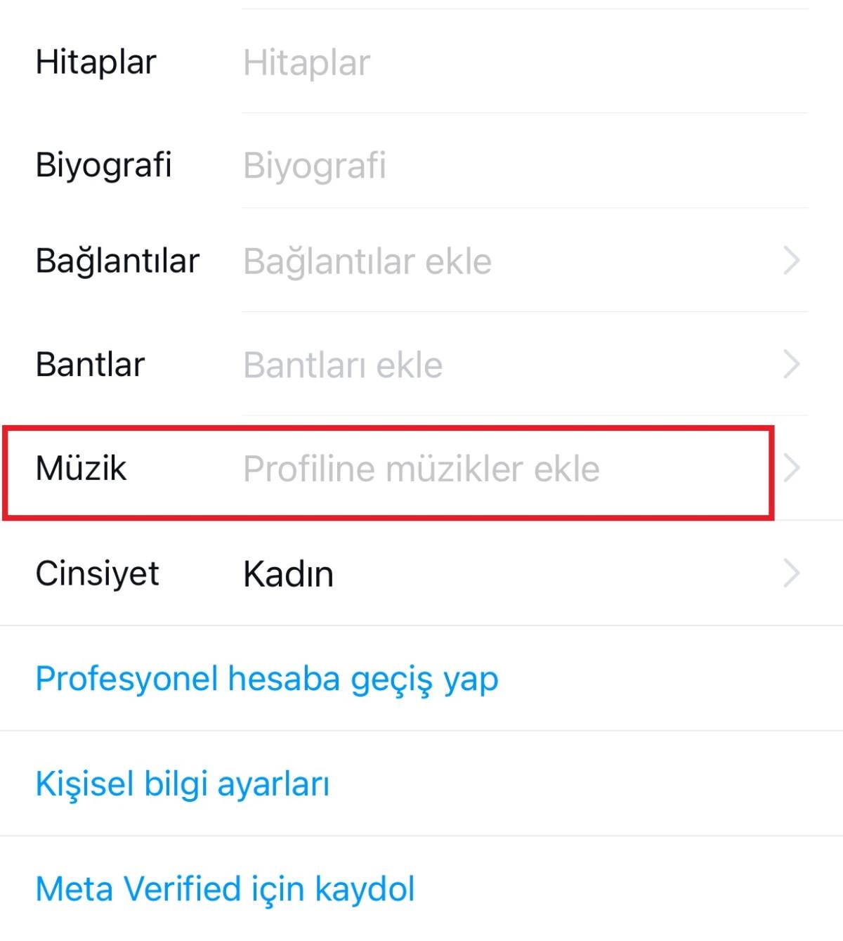 Biyografi seçeneğinin altında yer alan “müzik” seçeneğini seçin.