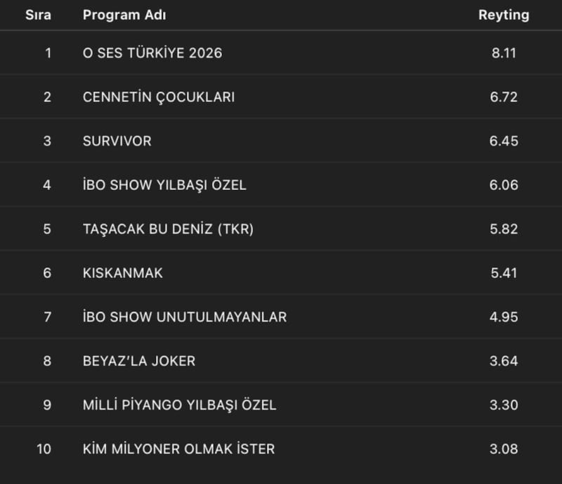 İkinci sırada Cennetin Çocukları dizisi, üçüncü sırada ise 1 Ocak tarihinde başlayan Survivor 2026 yer aldı.