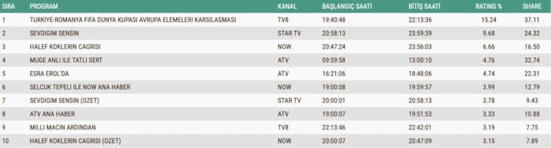Dün akşam Dünya Kupası elemeleri kapsamında oynanan Türkiye - Romanya maçı reytinglerde birinci sıraya yerleşti.