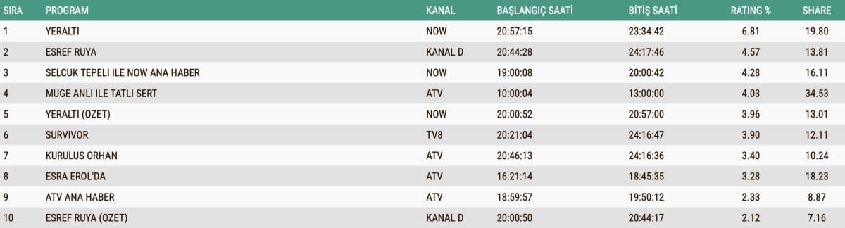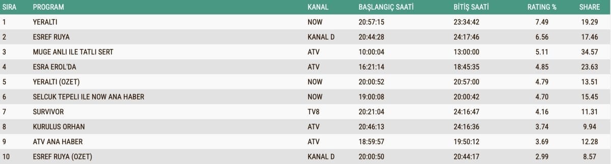 - Eşref Rüya ikinci, Müge Anlı ile Tatlı Sert üçüncü sıraya yerleşti.