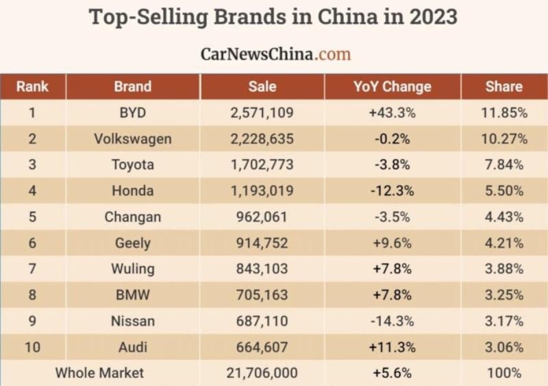 Son dönemin popüler otomobil üreticisi BYD, Çin'de 15 yıldır en çok satan marka olan Volkswagen'i 2023 yılında geride bırakmayı başardı.