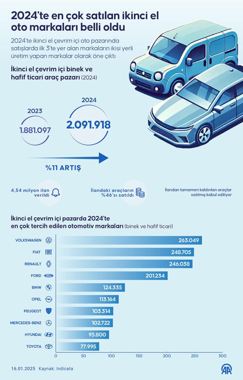 İkinci el çevrim içi pazarda 2024'te en çok tercih edilen otomotiv markası (binek ve hafif ticari) 263 bin 49 satış ile Volkswagen oldu. Bunu, 248 bin 705 ile Fiat ve 246 bin 38 ile Renault takip etti.