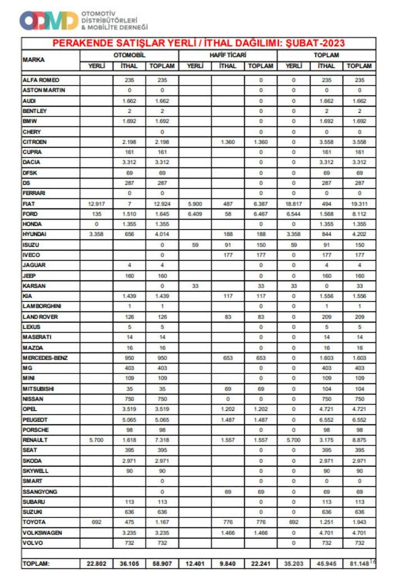 Şubat ayında otomobil ve hafif ticari araç pazarı, 2022 yılı Şubat ayına göre yüzde 63,4 büyüyerek 81 bin 148 adet olurken, bu tüm zamanların en yüksek şubat ayı olarak kayıtlara geçti.