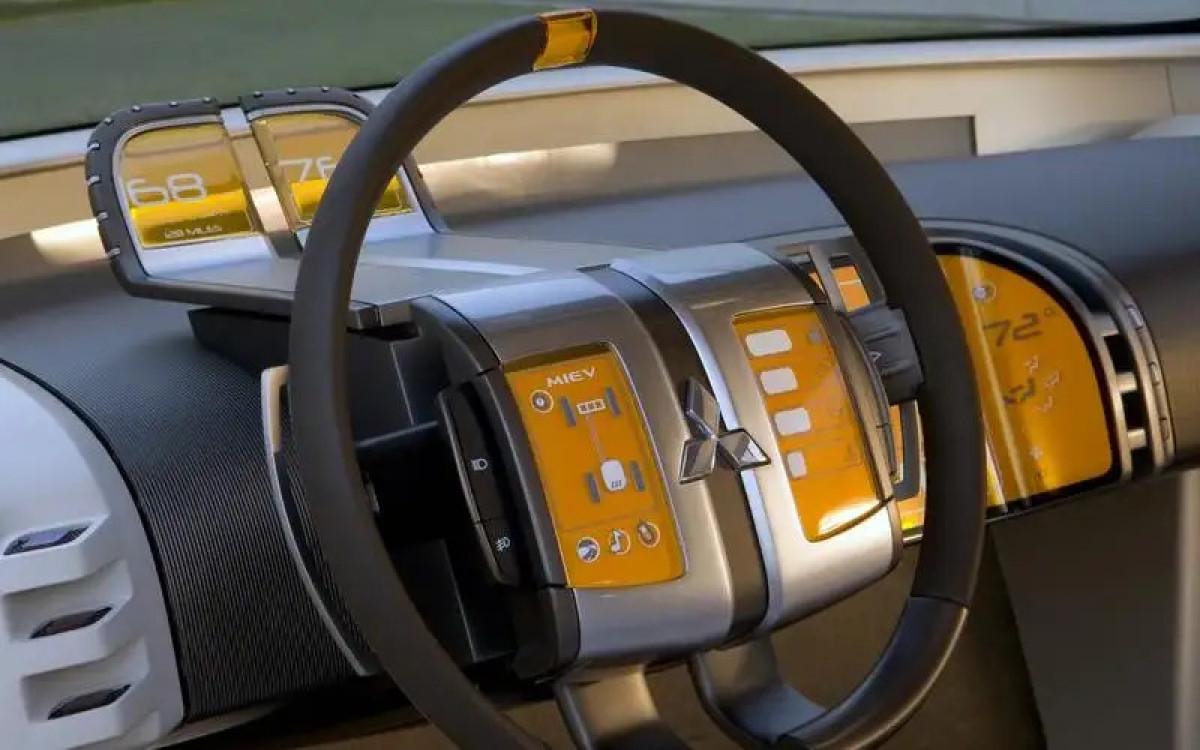 2006 CT-MiEV konseptinin direksiyon simidinin sol tarafında, hibrit aktarma organlarının bir diyagramı ve sürücünün medya ve navigasyon menülerine erişmesine izin veren düğmeler bulunuyordu.