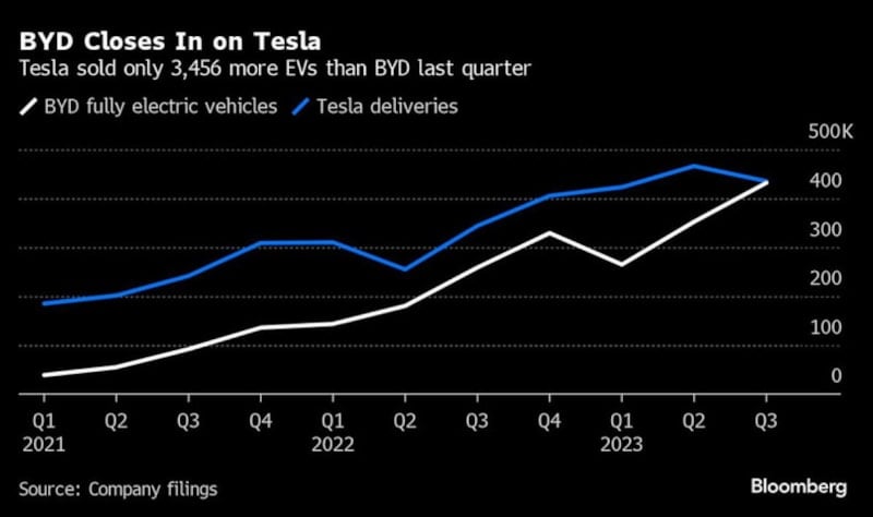Çin'in en büyük otomobil üreticisi BYD, tamamen elektrikli araç satışlarında yeni dünya lideri olarak Tesla'yı geride bırakmaya hazırlanıyor.
