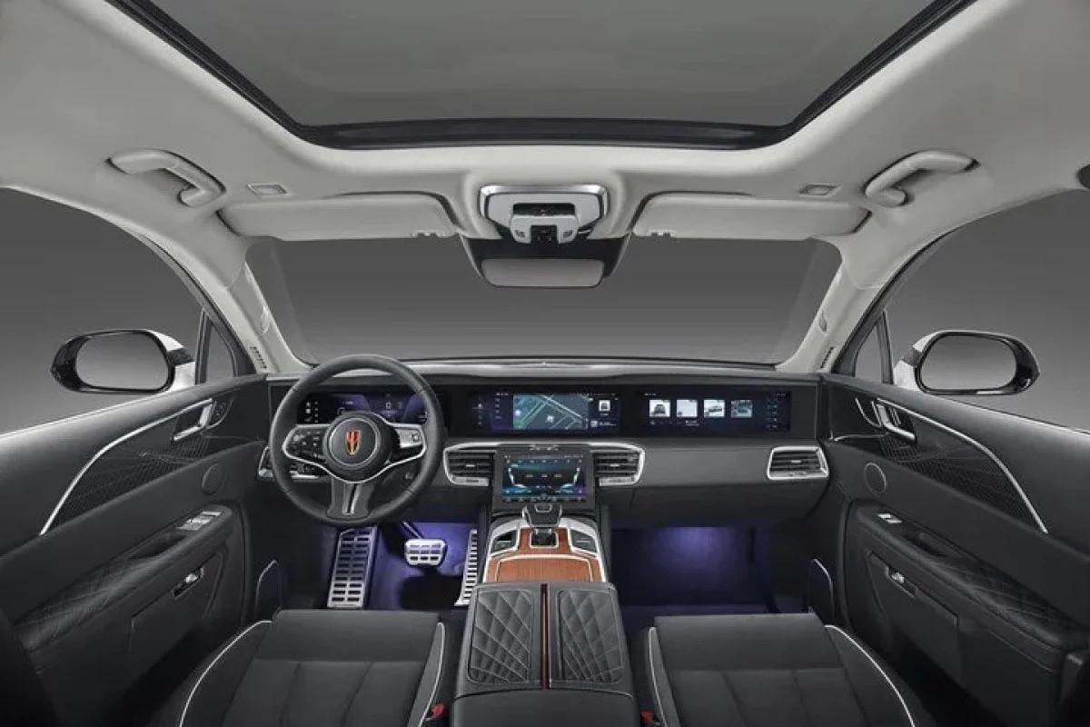 Hongqi E-HS9, kilit açma, sıcaklık düzenleme, akıllı ses kontrolü ve cep telefonu aracılığıyla uzaktan araç kontrolü gibi işlevleri gerçekleştirebilen akıllı sensörlü direksiyon simidine ve 6 adet akıllı ekrana sahip.