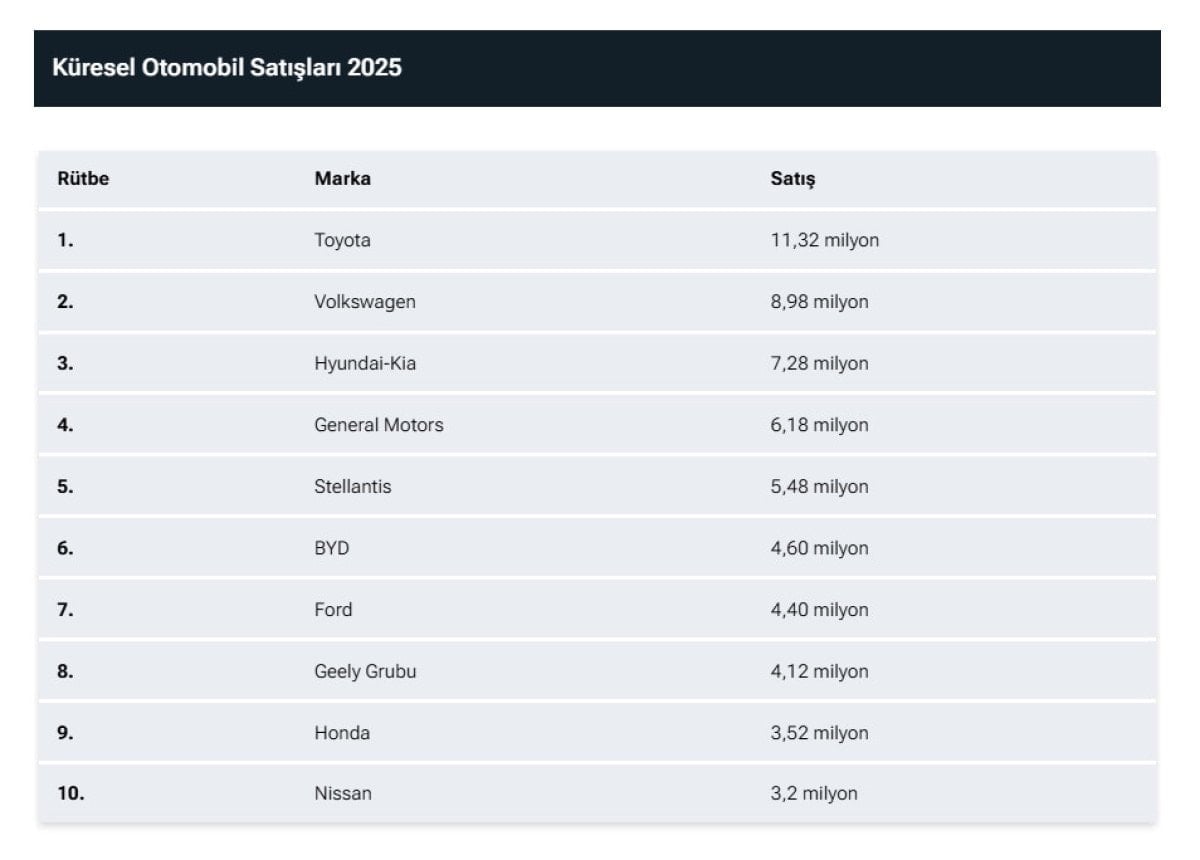Listenin zirvesinde Toyota’yı 8,98 milyon satışla Volkswagen ve 7,28 milyon satışla Hyundai-Kia grubu takip ediyor.