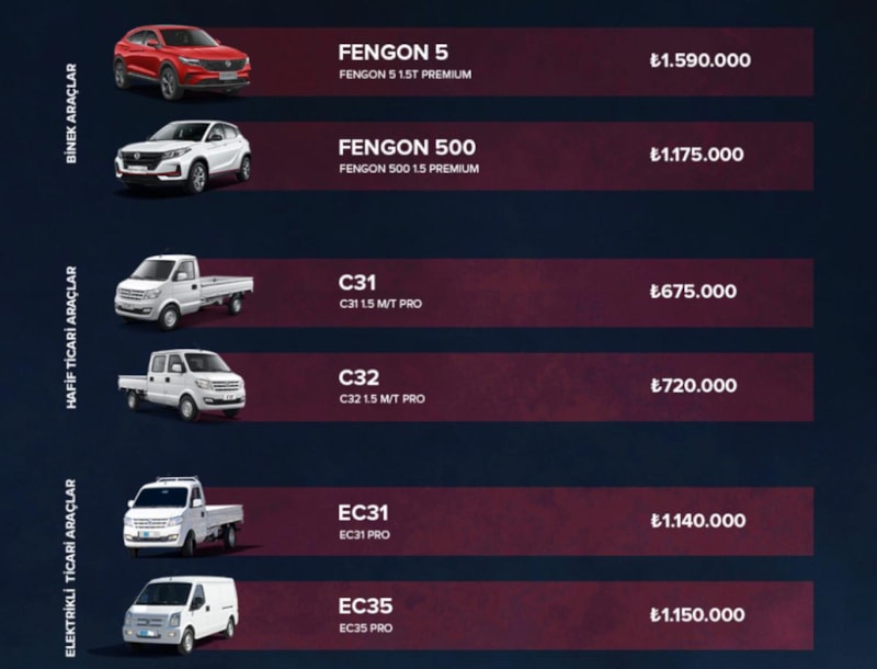 Çinli üreticinin SUV modellerini C segmentinde yarışa katılan Fengon 500 ve coupe SUV Fengon 5 modelleri oluşturuyor.