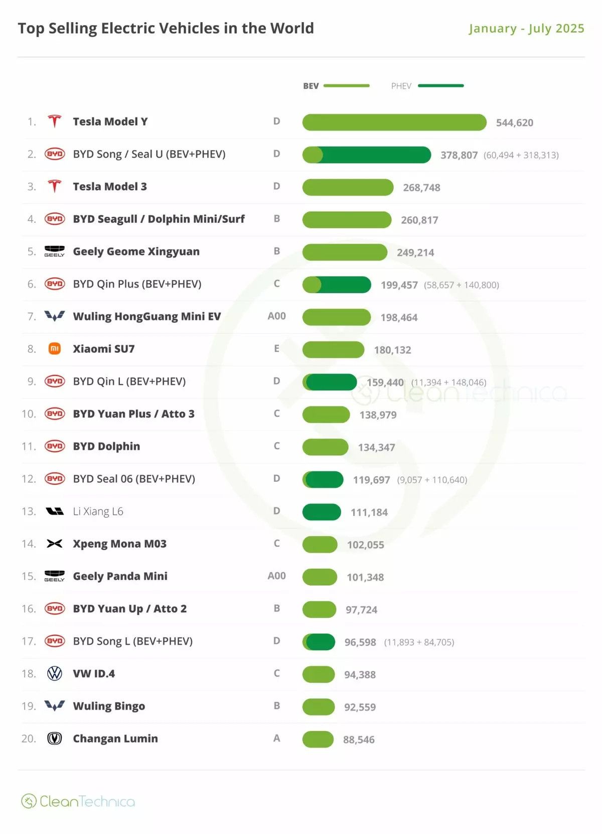 CleanTechnica tarafından paylaşılan güncel veriler, Ocak-Temmuz 2025 döneminde dünyada en çok satan modelleri ortaya koydu.