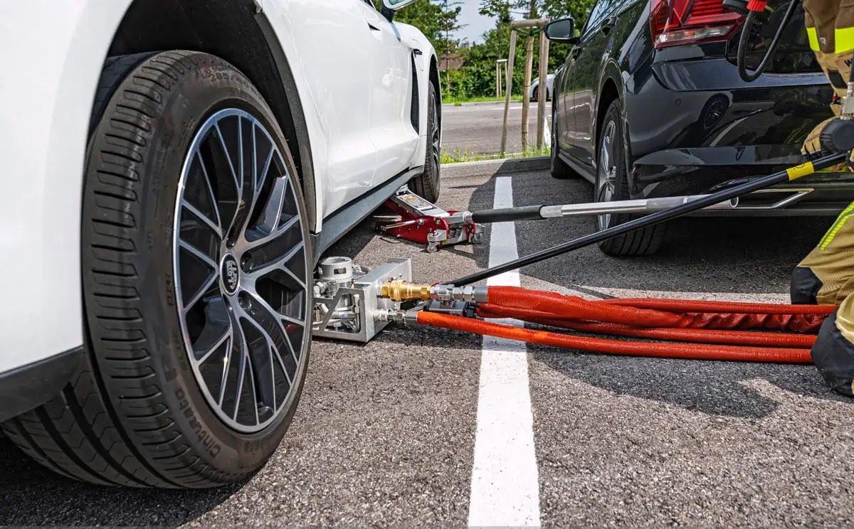 Elektrikli araçlar piyasaya sürüldükçe, yangın söndürmek için yeni cihazlar da geliştiriliyor. Dünya genelindeki bazı itfaiye departmanları, bir arabanın altına kayan ve doğrudan alt takıma su püskürterek akü paketini soğutan özel bir ağızlık kullanıyor.