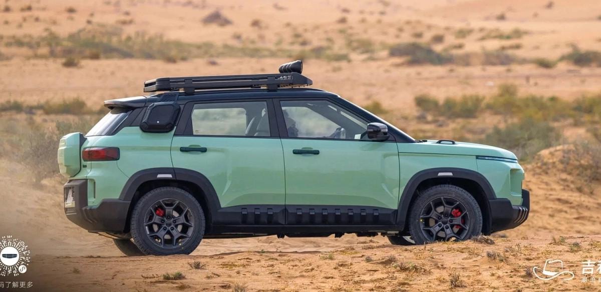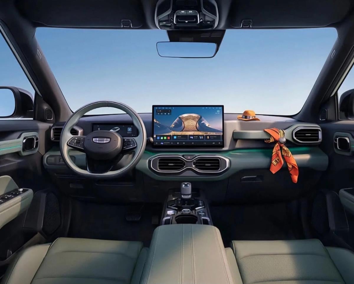 Geely Cowboy, bölünmüş farları, çift renkli gövde teması ve arazi araçlarını andıran aksesuarlarıyla göz alıcı bir tasarıma sahip.