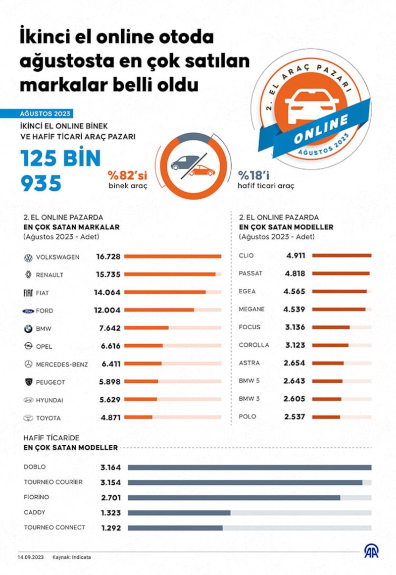 İkinci el online pazarda ağustosta en çok tercih edilen otomotiv markası (binek ve hafif ticari) 16 bin 728 Volkswagen oldu. Bunu, 15 bin 735 adetle Renault ve 14 bin 64 adetle Fiat takip etti.