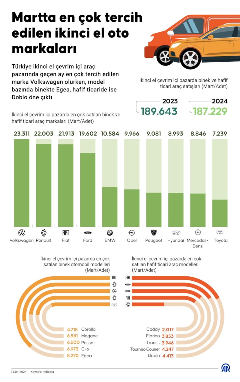 Türkiye'de ikinci el çevrim içi binek ve hafif ticari araç pazarında satış adedi martta, geçen yılın aynı dönemine göre yüzde 1,27 düşüş gösterdi. İşte en çok satılan marka ve modeller.