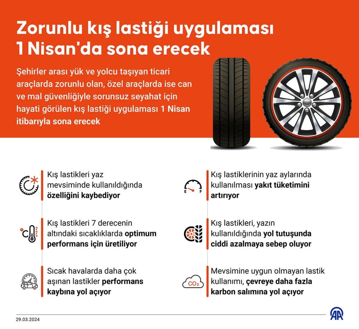 İstanbul'da 25 Kasım 2023, Türkiye genelinde ise 1 Aralık 2023'te başlayan zorunlu kış lastiği takma zorunluluğu uygulaması, 1 Nisan Pazartesi günü sona erecek.