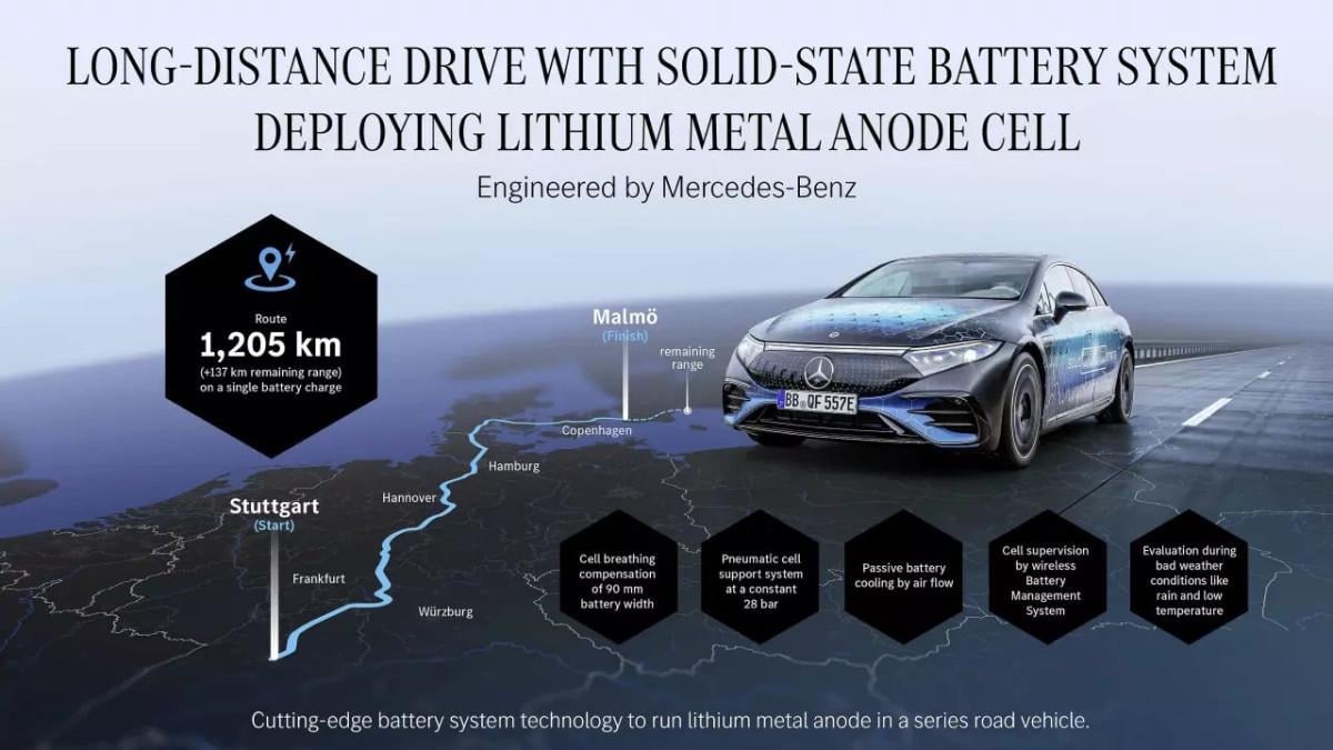 - Mercedes-Benz, katı hâl lityum metal hücreleri ile donatılan EQS modeli ile 1205 km yol alarak elektrikli araç menzilinde rekor kırdı.