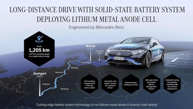 Sene başında yol testlerine başladığı katı hâl lityum metal hücreler ile donatılan özel bir Mercedes-Benz EQS, tek şarjla 1205 kilometre yol giderek elektrikli araç menzilinde yeni bir rekor kırdı.